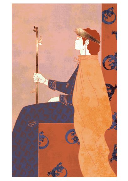 Met deze Koning wil je geen ruzie krijgen… Hij houdt een bloeiende Staf in zijn hand, die creativiteit en levensdrift symboliseert. Net als de Page en Ridder draagt hij kleding met vurige en krachtige salamanders erop. Het grote verschil is dat de dieren op het koninklijke gewaad zichzelf allemaal in de staart bijten! Dit is een symbool van volgroeiing. Het laat zien dat deze Koning het vuur in zichzelf heeft getemd en het succesvol, en zonder gevaar, kan inzetten.